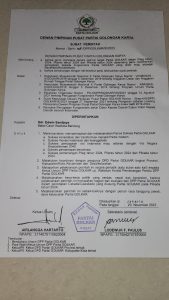 Dirinya mengaku, telah mendapatkan surat perintah dengan Nomor: Sprin-968/DPP/Golkar/XI/2023 yang keluar pada 20 November dan ditandatangani oleh Erlangga Hartanto selaku ketua DPP Partai Golkar dan Lodewijk F. Paulis sebagai Sekjen DPP Partai Golkar