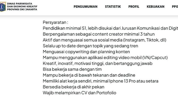 Sebelumnya Disparekraf DKI Jakarta memang membuka banyak lowongan kerja dengan berbagai posisi. Lowongan ini dibuka melalui program Rekrutmen Tenaga Ahli Publikasi Enjoy Jakarta Tahap 1 TA 2024.