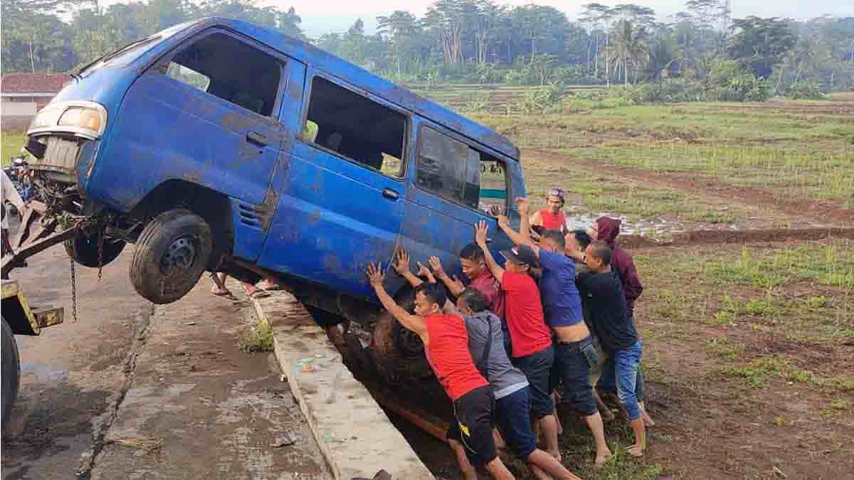 Mesin Tiba-Tiba Mati, Mobil Angkutan Umum di Ciamis Terguling ke Sawah