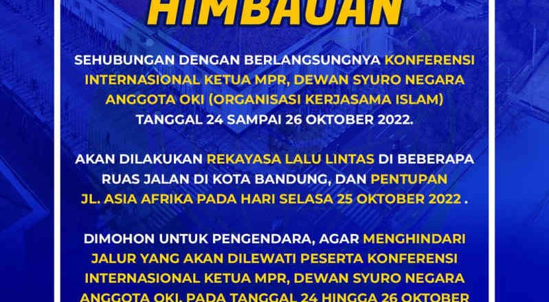 Polrestabes Bandung akan melakukan pengalihan arus di beberapa ruas jalan di Kota Bandung terkait pelaksanaan Konferensi Tingkat Tinggi (KTT) Organidasi Kerja Sama Islam (OKI) yang digelar di Gedung Merdeka, Kota Bandug. Pengalihan arus akan dilakukan mulai 24 hingga 26 Oktober 2022.