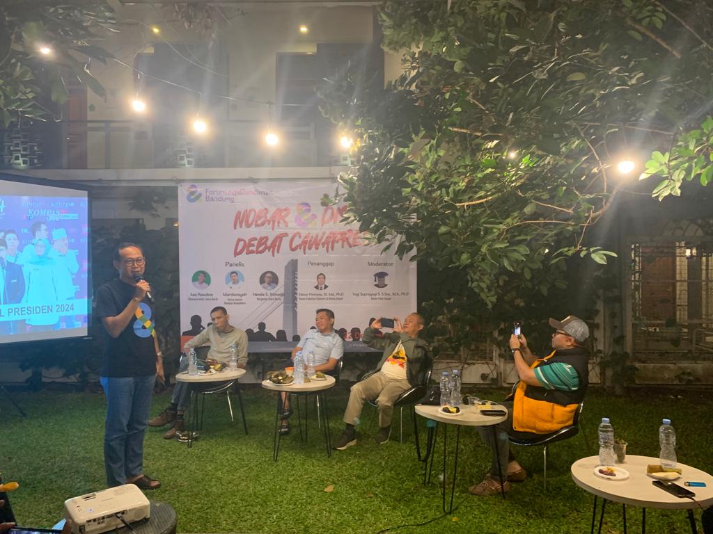 “Karena sekarang musim Pilpres, maka kegiatan Forum ngaDandanan Bandung kita mulai dengan acara Nobar Debat Cawapres,” ujar Dandan Riza Wardana.