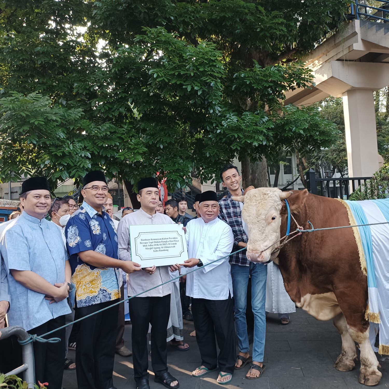 Usai melaksanakan salat Iduladha, Farhan mengungkapkan, Kota Bandung menerima bantuan satu ekor sapi kurban dari Presiden Republik Indonesia, Prabowo Subianto, dengan berat mencapai 1,2 ton. Sapi tersebut merupakan hasil ternak dari peternak muda di Kecamatan Cibiru, Kota Bandung.